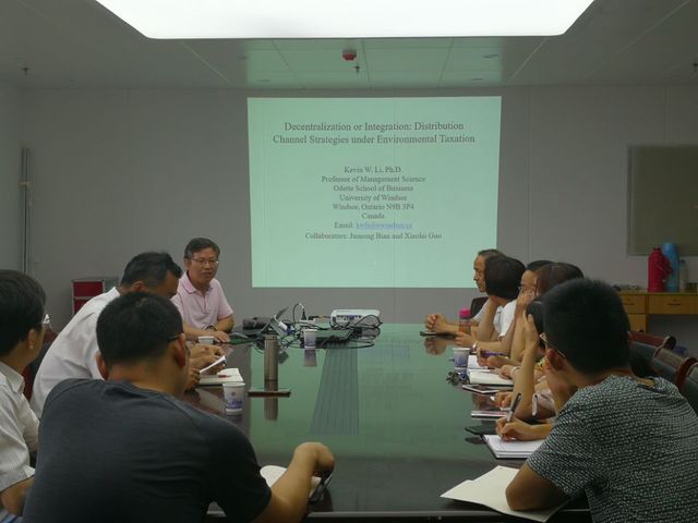 68日下午,应管理工程学院、科技处和研究生部的邀请,加拿大温莎大学Odette商学院李武教授于学院会议室做了一场题名为“Decentralization or Integration: Distribution Channel Strategies under Environmental Taxation”高水平的学术报告。副院长何朝林主持报告会,全体研究生和部分教师聆听了报告会。