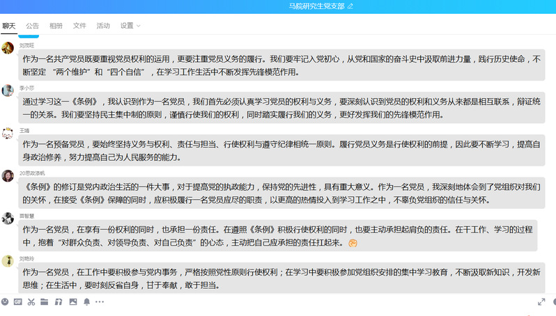 1月29日下午,马克思主义学院研究生党支部开展线上活动,专题研讨《中国共产党党员权利保障条例》。活动由支部书记裴利萍主持,全体研究生党员参加。