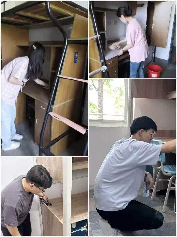 活动伊始,宿管阿姨分发毛巾和水桶,传授宿舍保洁经验,同学们认真学习和领悟打扫要点。在短暂的培训后,小分队成员分为男生女生两组,男生组到男生5栋二楼打扫空宿舍,女生组到女生8栋四楼打扫空宿舍。同学们积极配合,认真细致,努力将宿舍打扫整洁干净。
