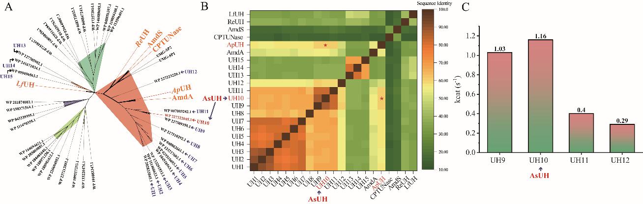图1 基于系统进化树分析结合基于深度学习工具DLKcat的动力学参数预测,从酸酸杆菌科源基因组数据库中挖掘新型EC水解酶